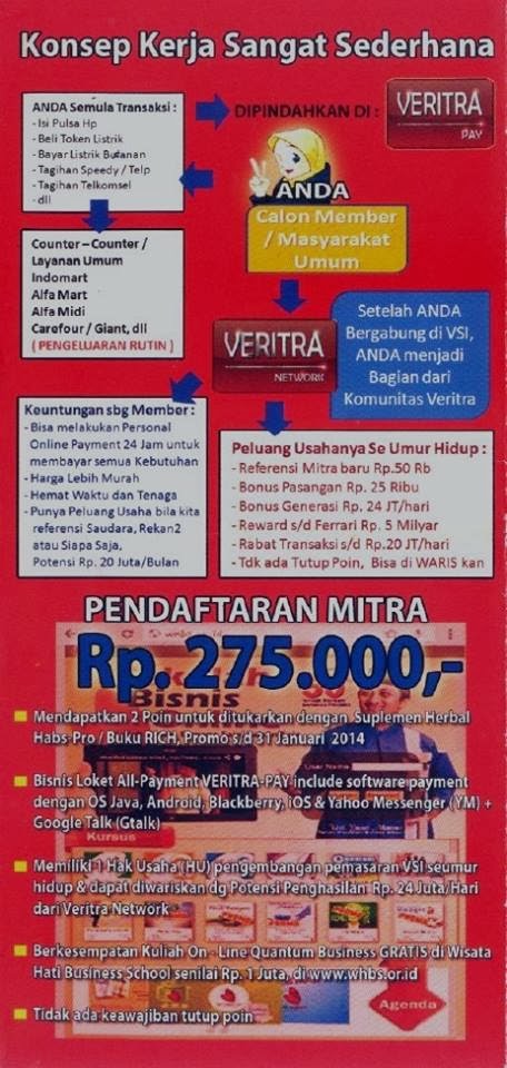 VSI itu bisnis baru Ɣªήğ didirikan Ustadz Yusuf Mansur..Ɣªήğ bertujuan untuk memandirikan bangsa indonesia. Beda dgn mlm Ɣªήğ lain...beda buangettt. MLM yusuf mansur ingsya اَللّهُ syar'i karena tdk ada tutup point,tidak ada keharusa belanja dengan nilai yg ditentukan dan tidak ada target Ɣªήğ lebih penting keanggotaannya bersifat seumur hidup dan dpt diwariskan. Sedangkan produk VSI sendiri adalah Jasa,qt memberikan jasa multi payment,atau bermacam2 pembayaran. Ɣªήğ sdh running saat ini adalah pulsa,token pulsa,listrik dan telpon pasca bayar..kedepannya VSI bisa melakukan buanyak lg transaksi. Spt pajak,asuransi,etoll,internet, tv cable dll. VSI jg nantinya akan menyediakan tiket pesawat,kereta,bus. Gabung disini muraaaah meriiiah buangan hanya Rp.275rb. Bri syariah. Tiap qt transaksi qt akan dapet cash back loh.. Cash back semua transaksi itu Rp.1000,- kecuali pulsa cash. Pendaftaran Rp.275 Itu buat registrasi keanggotaan seumur hidup gk akan hanguuuuus. dpt Id number,pin,produk habspro dan buku tab.plus atm BRI Syariah..
